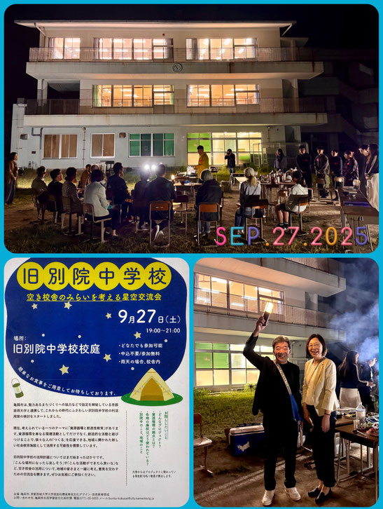 本日、亀岡市と京都芸術大学におきましてプロジェクトに関わっていただいている先生、学生の皆さまにより、旧別院中学校校庭で「空き校舎の活用」について、地域の皆さまと一緒に考える交流の場を設けていただきました。多くの住民の皆さまにとって思い出深い学校が、新たな価値を生み出し、地域が元気になることを願います。
